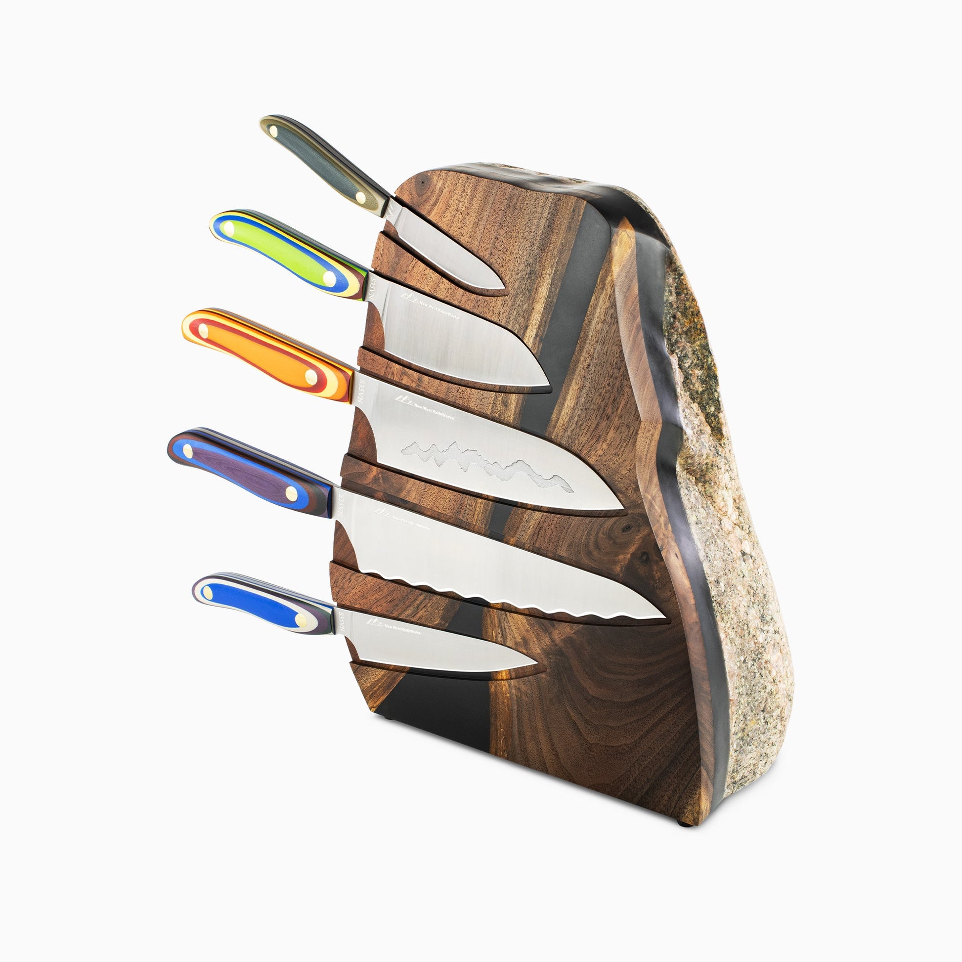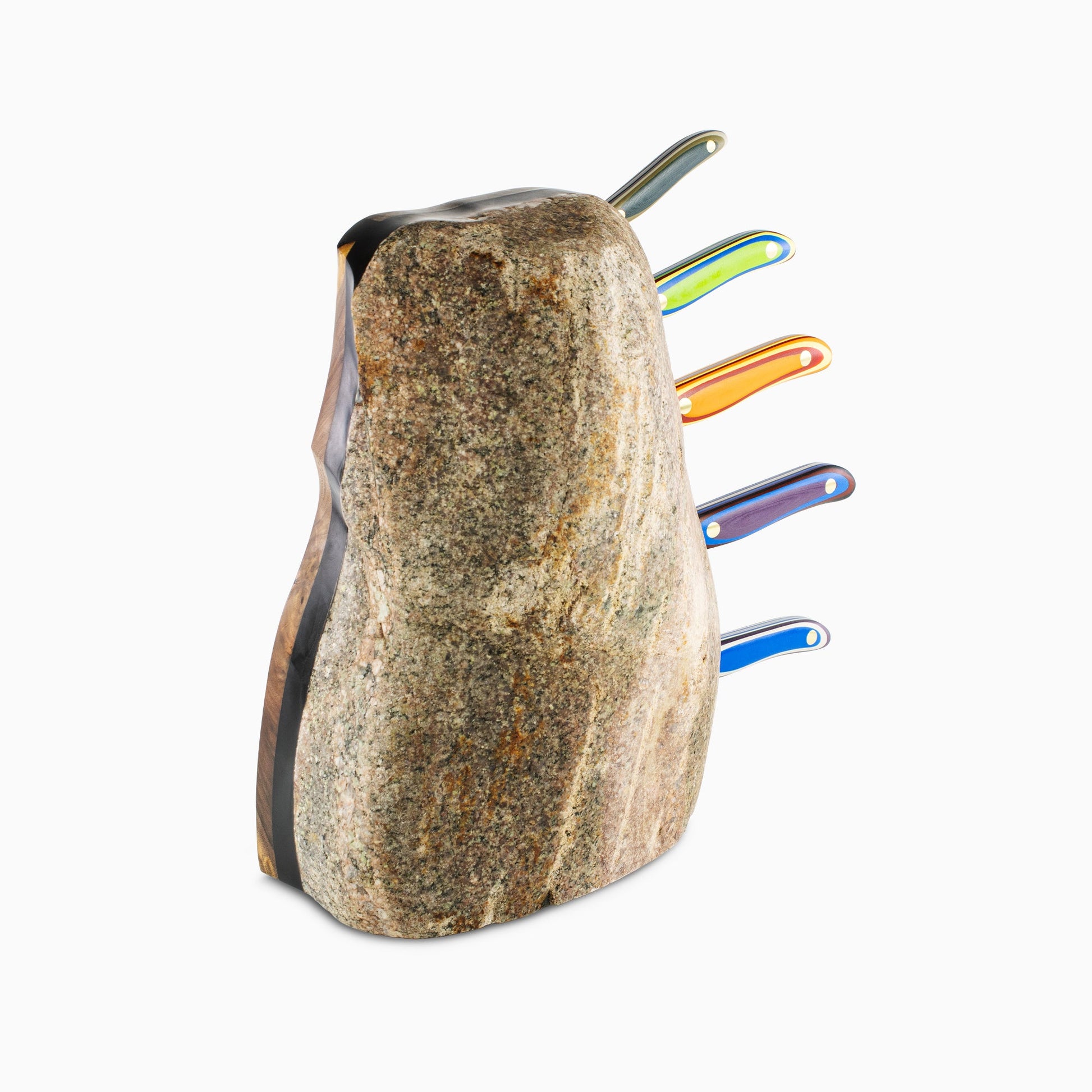 Mixed media rock blocks are the culmination of our commitment to "functional art." Our makers work with river stones, wood, and resin to produce a stunning and practical vessel that keeps knives conveniently at hand while transforming the kitchen into an aesthetic space