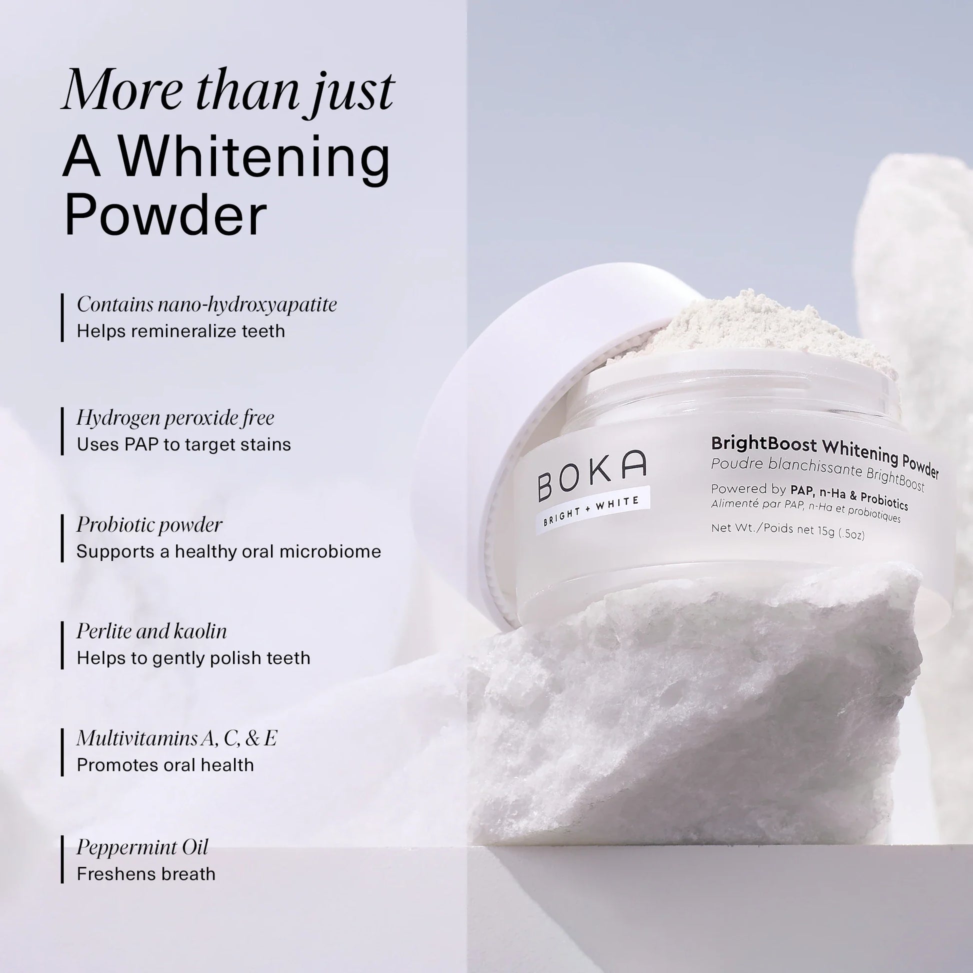 Brighten your smile with Boka BrightBoost Whitening Powder—formulated with Phthalimido-Peroxy-Caproic Acid (PAP) to help remove surface stains without hydrogen peroxide. Nano-hydroxyapatite supports enamel health, while probiotics and soothing aloe vera round out the formula.