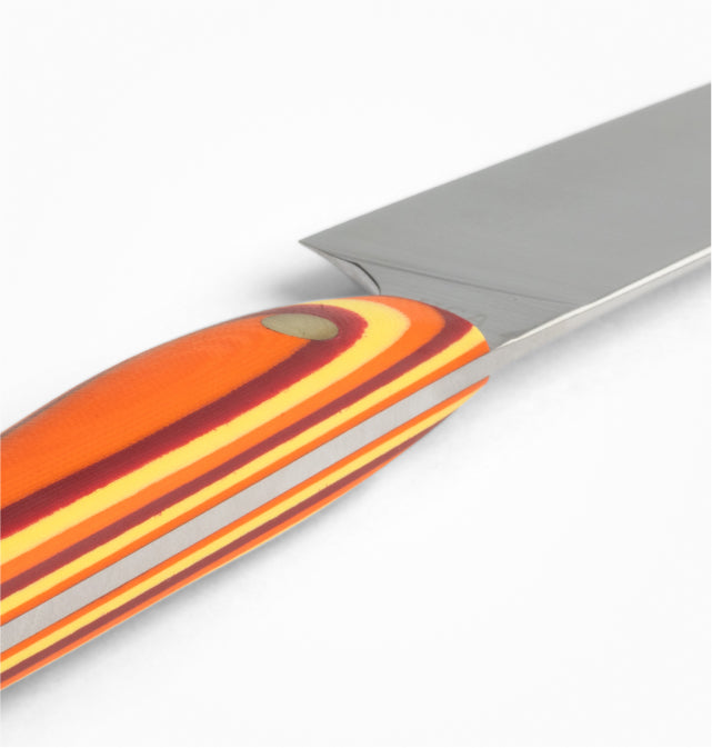 The New West KnifeWorks' Chris Kidder is the ultimate chef knife. Don't be intimidated by the size of this knife, the extra length adds leverage for slicing everything from sushi to meats, soft ripe vegetables, or crusty bread. The length allows you to leave the tip on the cutting board while you lever up and down in a traditional European style. Resting the tip on the cutting board gives added control for incredibly precise cutting. In SoCal, most meals have some component of raw fish, sushi, sashimi or crudo. The long blade slices raw fish with the precision of a Japanese Yanagiba or sushi knife. This knife can perform all the chopping, dicing, and general-purpose work of a chef knife while having the added length to cleanly slice the softest food in one long stroke.