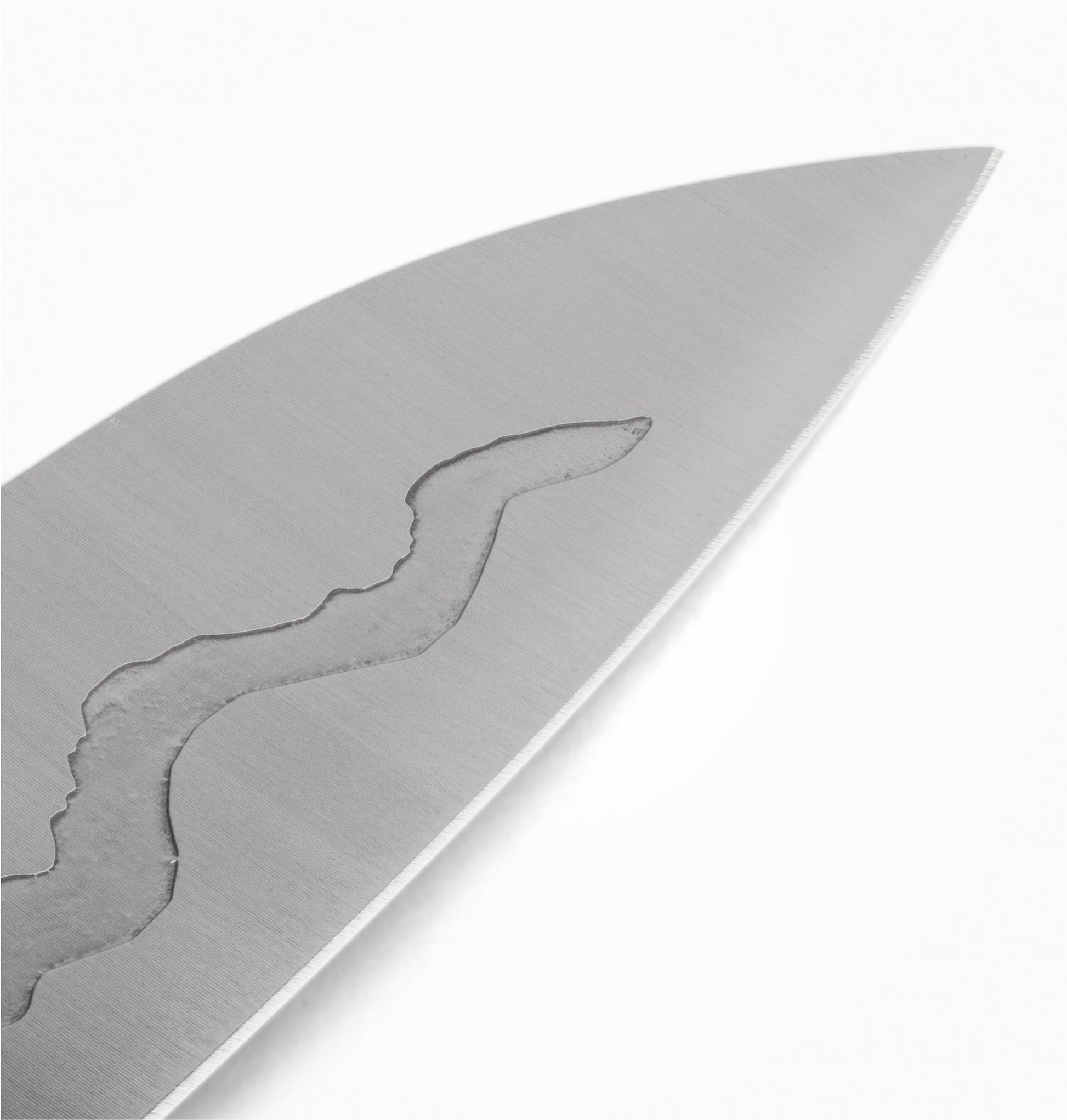 The Teton Edge Santoku represents an evolution in the history of blade design. The "Edge" replaces the traditional santoku "dimple grind" with an etched homage to the iconic Teton Mountain range of Jackson Hole. Like a traditional dimple grind, the Teton Edge helps the blade slice smoothly through food without sticking, but the Edge does it even better. Heat generated in traditional machine-grinding the dimples can disrupt and distort the precision of the steel's heat treatment. Our solution: a proprietary cold process used to etch the "Edge" which enhances the performance while optimizing the steel. The Teton Edge celebrates the spirit of Jackson Hole, New West Knifeworks's home, both visually and functionally, while redefining the cutting edge of peak performance.
