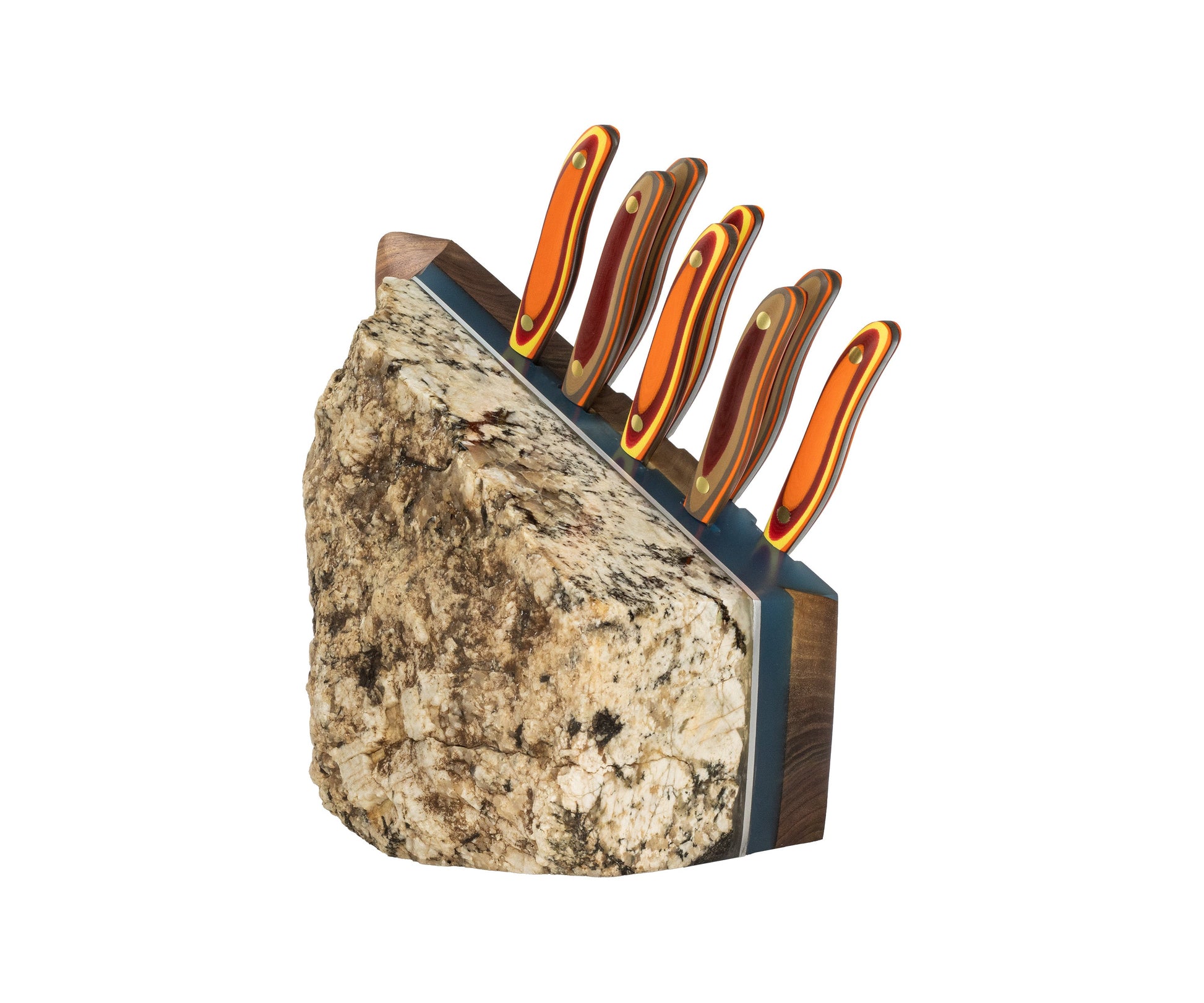 This rock block is specifically designed to hold 8 New West KnifeWorks steak knives. All knives are resting in fitted wooden slots.
