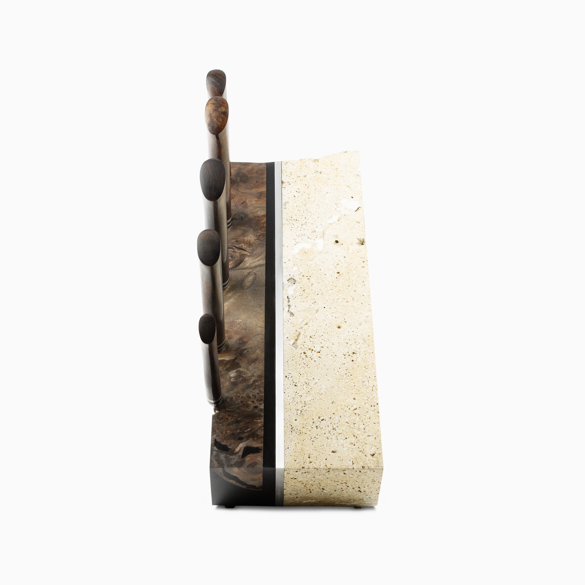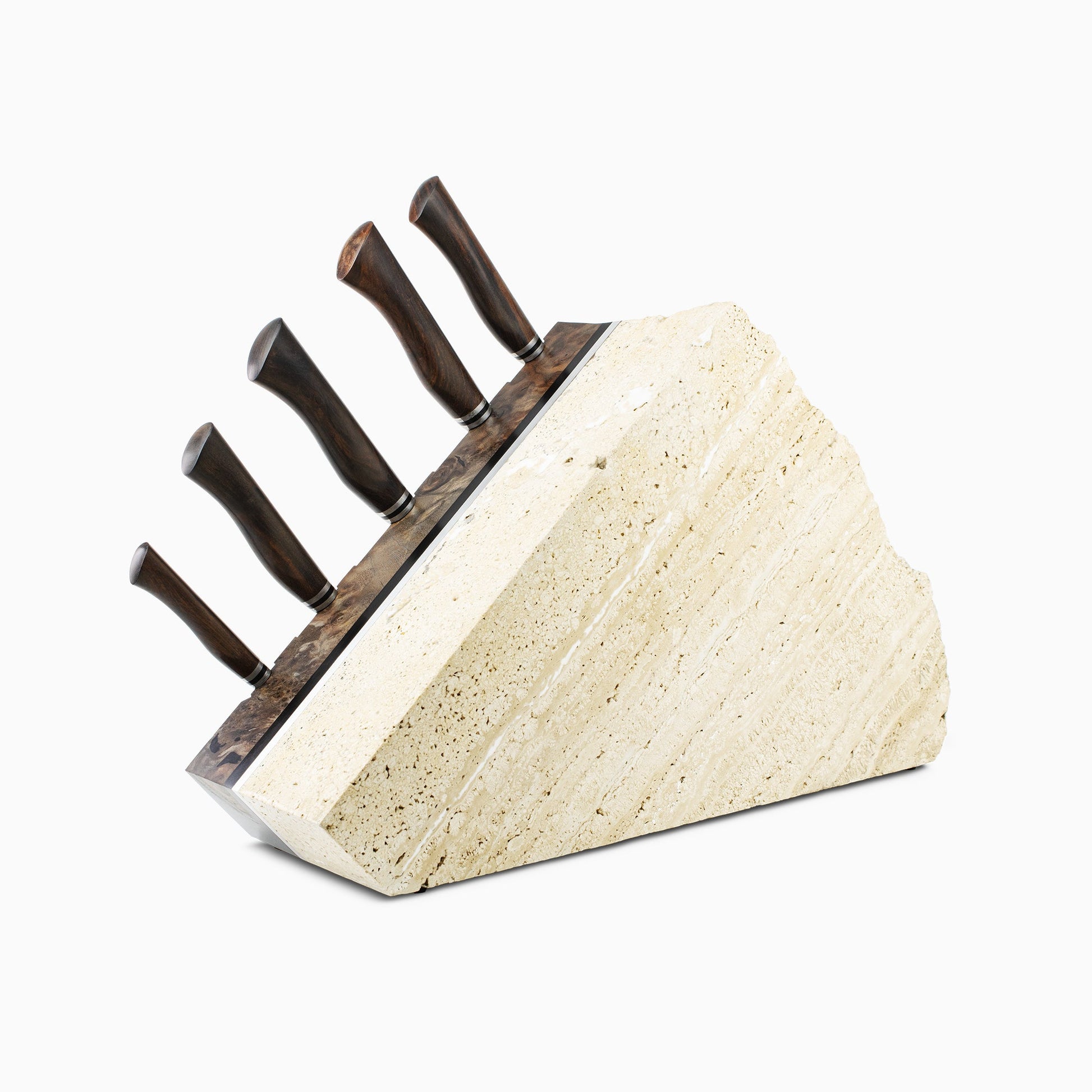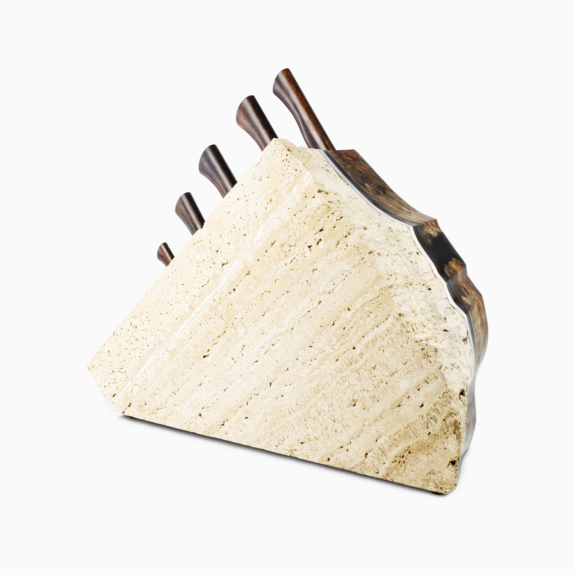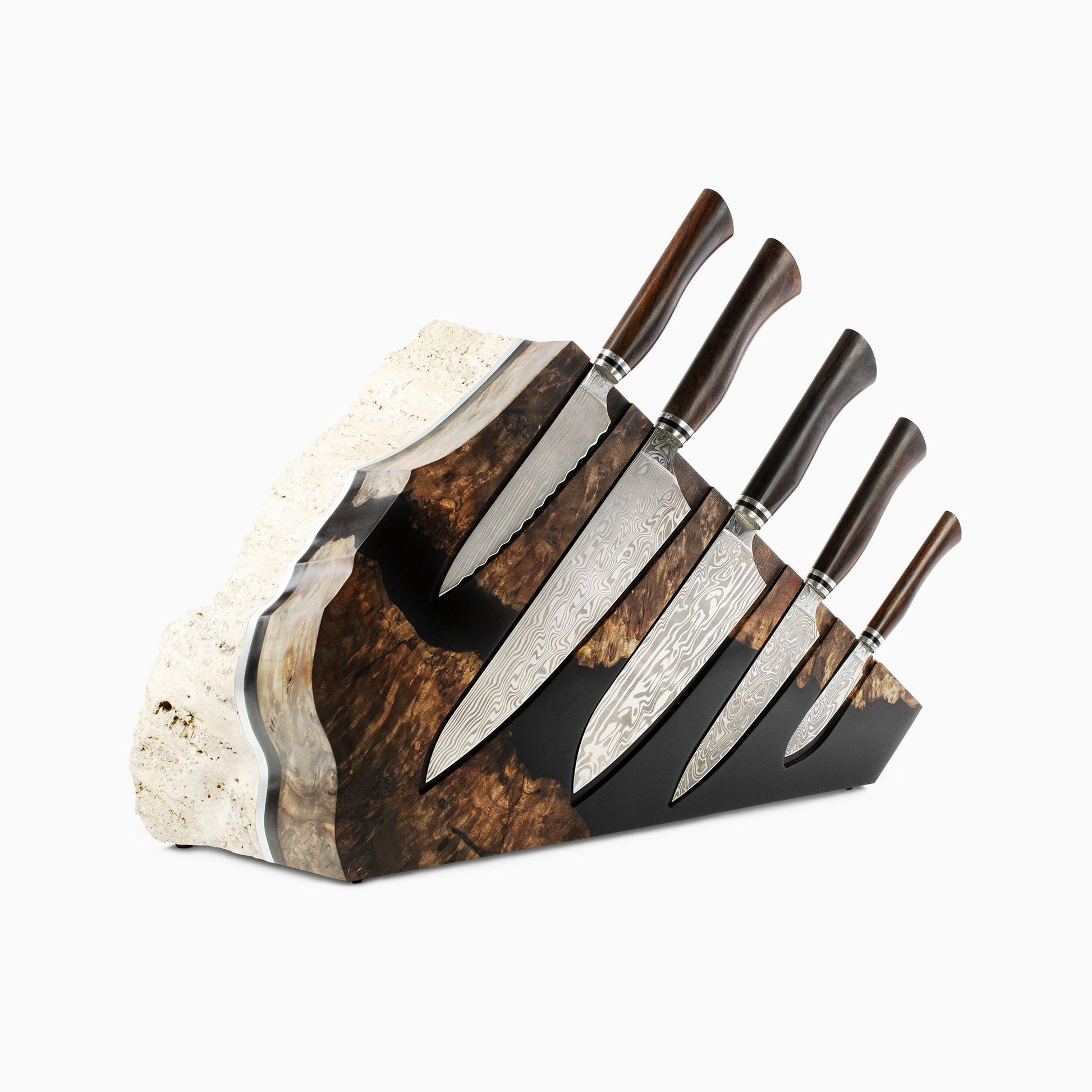 Combining the most advanced steel and design available anywhere in the world, the Uru Chef Knife Set takes the cutting edge to its current limit. Damasteel blades paired with Desert Ironwood handles, this set includes the 9" Chef, 7" Santoku, 6" Petty, 6" Deli, and 3" Paring knives housed in the one-of-a-kind Apollo Rock Block. This mixed-media rock block is hand-crafted from Idaho Travertine, Walnut Burl, Black Resin, and is tied together with a stylish Aluminum band. The stunning and practical vessel will keep your Uru chef knives conveniently at hand while transforming the kitchen into an aesthetic space.