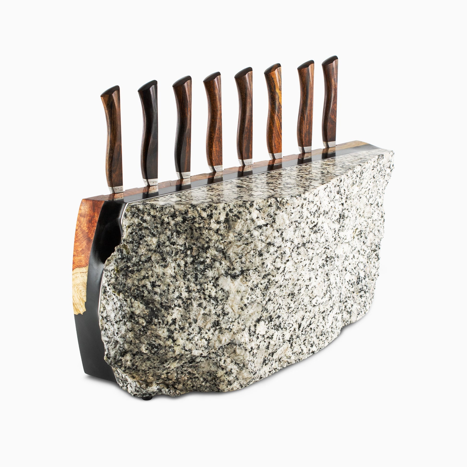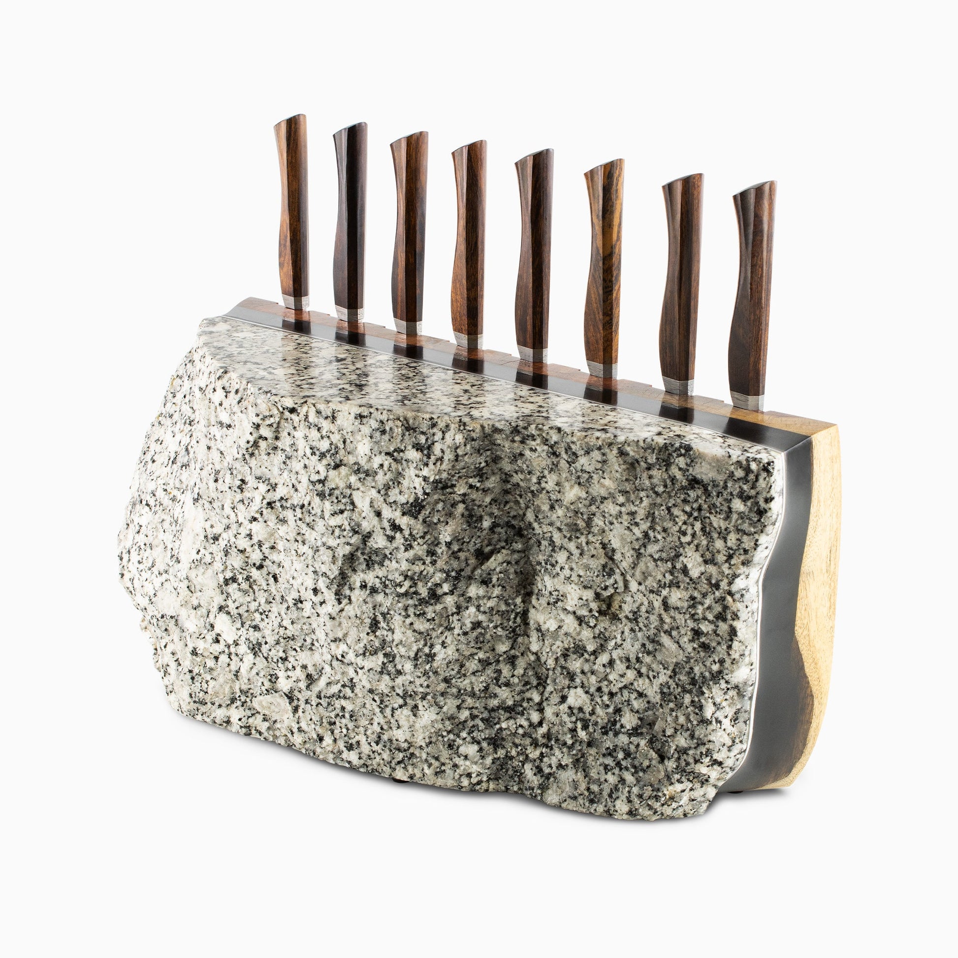 After months of testing various hardwoods and laminate woods for durability, water resistance, and overall look and feel, the richly textured desert ironwood rose to the top. These richly grained handles and super sharp blades will impress the most selective chef knife aficionados.