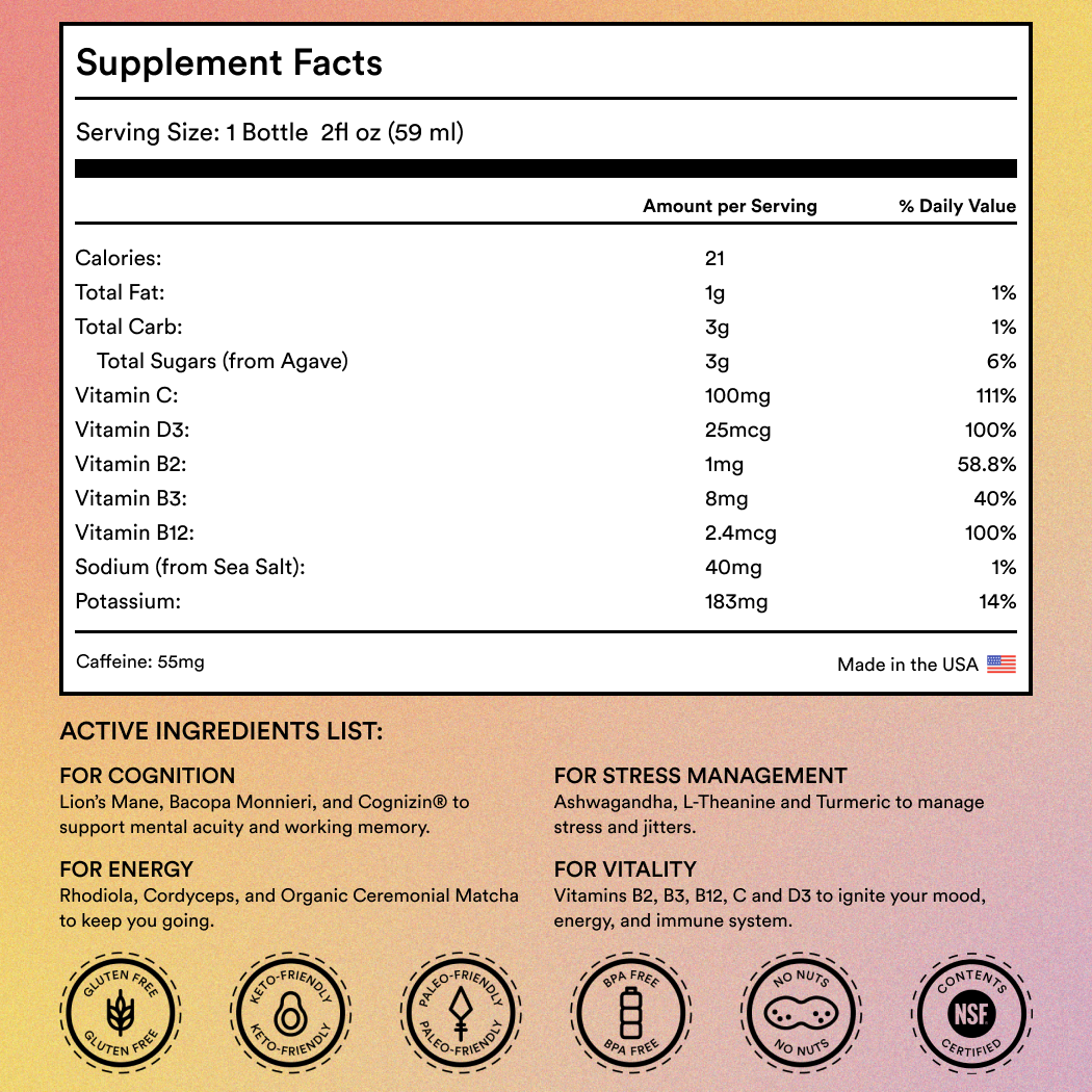A mental performance shot infused with nootropics, adaptogens, and vitamins designed to crush procrastination, brain fog, & fatigue.